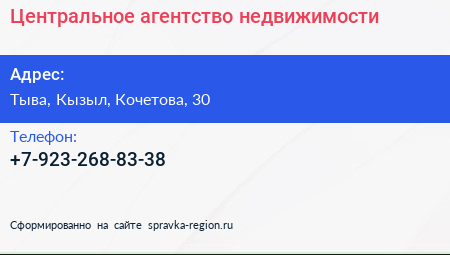 Центральное, агентство недвижимости по адресу Тыва, Кызыл, Кочетова, 30 в дальнейшем Организация, размещена в следующих категориях: