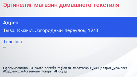 Эргинелиг, магазин домашнего текстиля по адресу Тыва, Кызыл, Загородный переулок, 19/3 в дальнейшем Организация, размещена в следующих категориях: