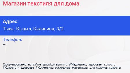 Магазин текстиля для дома по адресу Тыва, Кызыл, Калинина, 3/2 в дальнейшем Организация, размещена в следующих категориях: