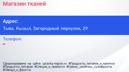 Магазин тканей по адресу Тыва, Кызыл, Загородный переулок, 29 в дальнейшем Организация, размещена в следующих категориях: