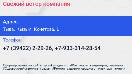 Свежий ветер, компания по адресу Тыва, Кызыл, Кочетова, 1 в дальнейшем Организация, размещена в следующих категориях: