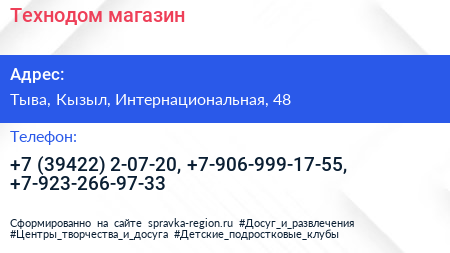 Технодом, магазин по адресу Тыва, Кызыл, Интернациональная, 48 в дальнейшем Организация, размещена в следующих категориях: