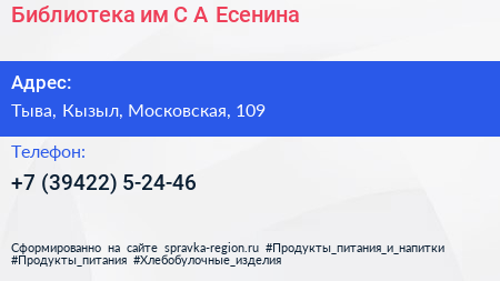 Библиотека им. С.А. Есенина по адресу Тыва, Кызыл, Московская, 109 в дальнейшем Организация, размещена в следующих категориях: