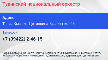Тувинский национальный оркестр по адресу Тыва, Кызыл, Щетинкина-Кравченко, 46 в дальнейшем Организация, размещена в следующих категориях: