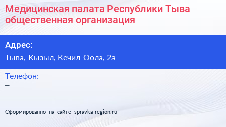 Медицинская палата Республики Тыва, общественная организация по адресу Тыва, Кызыл, Кечил-Оола, 2а в дальнейшем Организация, размещена в следующих категориях: