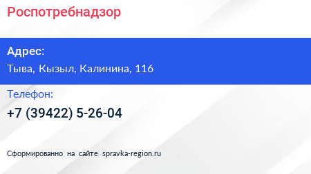 Роспотребнадзор по адресу Тыва, Кызыл, Калинина, 116 в дальнейшем Организация, размещена в следующих категориях: