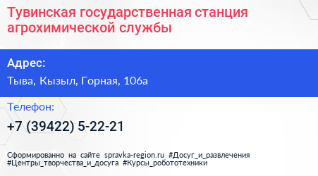 Тувинская, государственная станция агрохимической службы по адресу Тыва, Кызыл, Горная, 106а в дальнейшем Организация, размещена в следующих категориях: