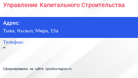 Управление Капитального Строительства по адресу Тыва, Кызыл, Мира, 15а в дальнейшем Организация, размещена в следующих категориях: