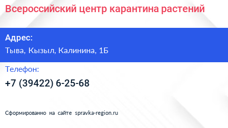 Всероссийский центр карантина растений по адресу Тыва, Кызыл, Калинина, 1Б в дальнейшем Организация, размещена в следующих категориях: