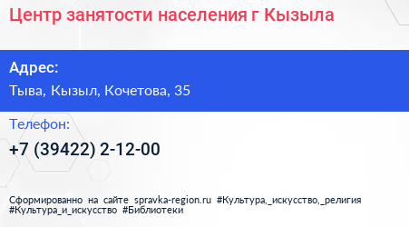 Центр занятости населения г. Кызыла по адресу Тыва, Кызыл, Кочетова, 35 в дальнейшем Организация, размещена в следующих категориях: