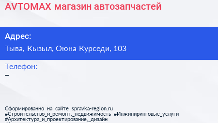 AVTOMAX, магазин автозапчастей по адресу Тыва, Кызыл, Оюна Курседи, 103 в дальнейшем Организация, размещена в следующих категориях: