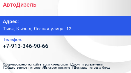 АвтоДизель по адресу Тыва, Кызыл, Лесная улица, 12 в дальнейшем Организация, размещена в следующих категориях:
