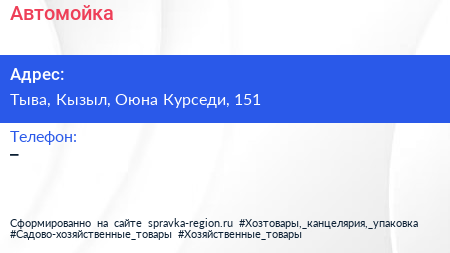 Автомойка по адресу Тыва, Кызыл, Оюна Курседи, 151 в дальнейшем Организация, размещена в следующих категориях: