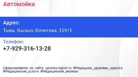 Автомойка по адресу Тыва, Кызыл, Кочетова, 159/1 в дальнейшем Организация, размещена в следующих категориях: