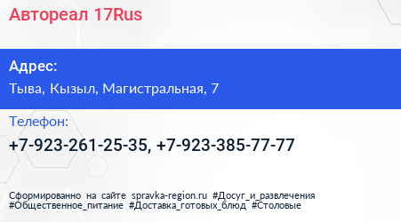 Автореал 17Rus по адресу Тыва, Кызыл, Магистральная, 7 в дальнейшем Организация, размещена в следующих категориях: