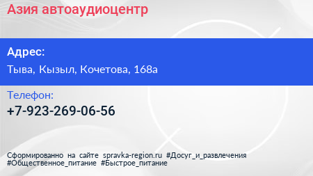 Азия, автоаудиоцентр по адресу Тыва, Кызыл, Кочетова, 168а в дальнейшем Организация, размещена в следующих категориях: