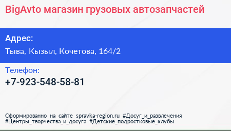 BigAvto, магазин грузовых автозапчастей по адресу Тыва, Кызыл, Кочетова, 164/2 в дальнейшем Организация, размещена в следующих категориях: