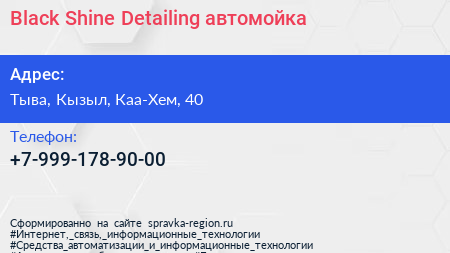 Black Shine Detailing, автомойка по адресу Тыва, Кызыл, Каа-Хем, 40 в дальнейшем Организация, размещена в следующих категориях: