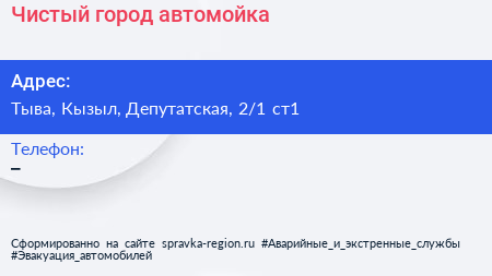 Чистый город, автомойка по адресу Тыва, Кызыл, Депутатская, 2/1 ст1 в дальнейшем Организация, размещена в следующих категориях: