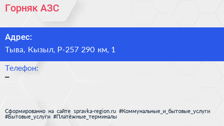 Горняк, АЗС по адресу Тыва, Кызыл, Р-257 290 км, 1 в дальнейшем Организация, размещена в следующих категориях: