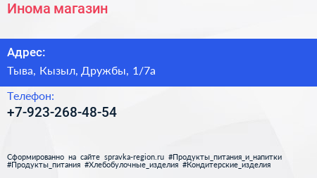 Инома, магазин по адресу Тыва, Кызыл, Дружбы, 1/7а в дальнейшем Организация, размещена в следующих категориях: