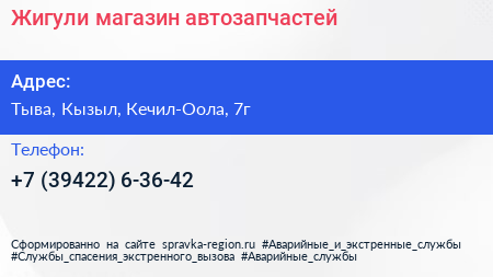 Жигули, магазин автозапчастей по адресу Тыва, Кызыл, Кечил-Оола, 7г в дальнейшем Организация, размещена в следующих категориях: