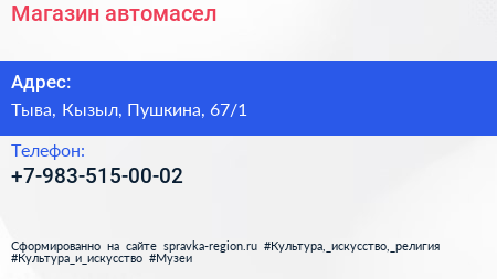 Магазин автомасел по адресу Тыва, Кызыл, Пушкина, 67/1 в дальнейшем Организация, размещена в следующих категориях: