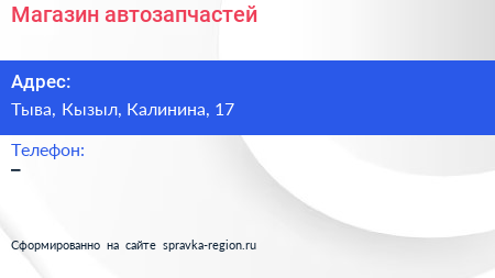 Магазин автозапчастей по адресу Тыва, Кызыл, Калинина, 17 в дальнейшем Организация, размещена в следующих категориях: