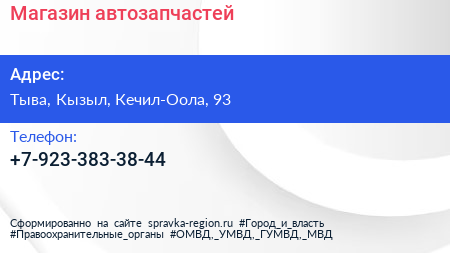 Магазин автозапчастей по адресу Тыва, Кызыл, Кечил-Оола, 93 в дальнейшем Организация, размещена в следующих категориях: