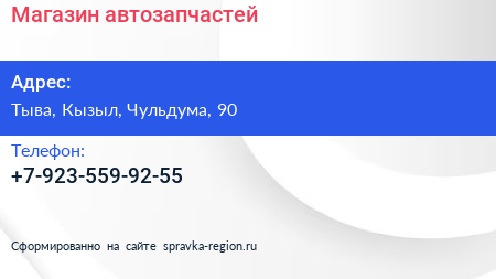 Магазин автозапчастей по адресу Тыва, Кызыл, Чульдума, 90 в дальнейшем Организация, размещена в следующих категориях: