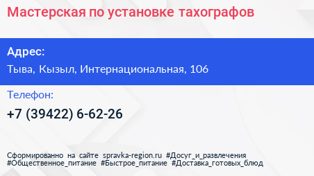 Мастерская по установке тахографов по адресу Тыва, Кызыл, Интернациональная, 106 в дальнейшем Организация, размещена в следующих категориях: