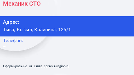 Механик, СТО по адресу Тыва, Кызыл, Калинина, 126/1 в дальнейшем Организация, размещена в следующих категориях: