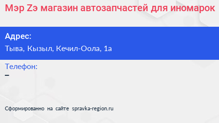 Мэр Zэ, магазин автозапчастей для иномарок по адресу Тыва, Кызыл, Кечил-Оола, 1а в дальнейшем Организация, размещена в следующих категориях: