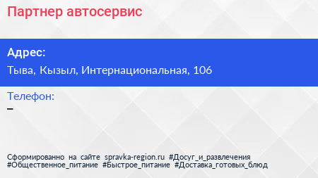 Партнер, автосервис по адресу Тыва, Кызыл, Интернациональная, 106 в дальнейшем Организация, размещена в следующих категориях: