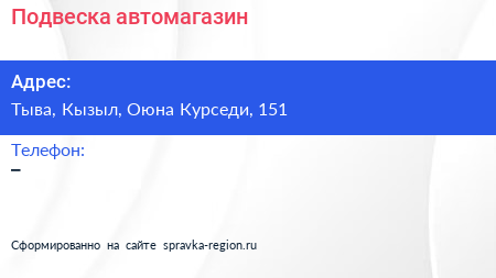 Подвеска, автомагазин по адресу Тыва, Кызыл, Оюна Курседи, 151 в дальнейшем Организация, размещена в следующих категориях: