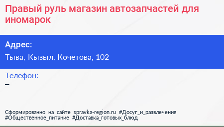 Правый руль, магазин автозапчастей для иномарок по адресу Тыва, Кызыл, Кочетова, 102 в дальнейшем Организация, размещена в следующих категориях: