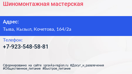 Шиномонтажная мастерская по адресу Тыва, Кызыл, Кочетова, 164/2а в дальнейшем Организация, размещена в следующих категориях: