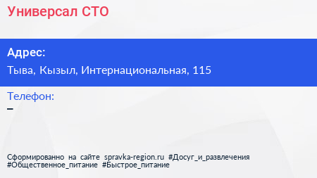 Универсал, СТО по адресу Тыва, Кызыл, Интернациональная, 115 в дальнейшем Организация, размещена в следующих категориях: