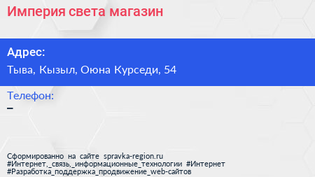 Империя света, магазин по адресу Тыва, Кызыл, Оюна Курседи, 54 в дальнейшем Организация, размещена в следующих категориях: