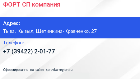 ФОРТ СП, компания по адресу Тыва, Кызыл, Щетинкина-Кравченко, 27 в дальнейшем Организация, размещена в следующих категориях: