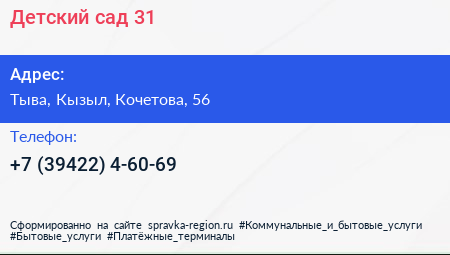 Детский сад №31 по адресу Тыва, Кызыл, Кочетова, 56 в дальнейшем Организация, размещена в следующих категориях: