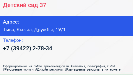 Детский сад №37 по адресу Тыва, Кызыл, Дружбы, 19/1 в дальнейшем Организация, размещена в следующих категориях: