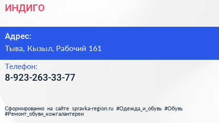 ИНДИГО по адресу Тыва, Кызыл, Рабочий 161 в дальнейшем Организация, размещена в следующих категориях: