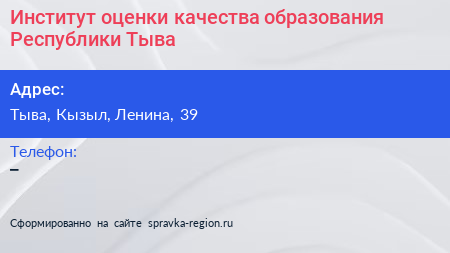 Институт оценки качества образования Республики Тыва по адресу Тыва, Кызыл, Ленина, 39 в дальнейшем Организация, размещена в следующих категориях: