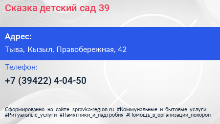 Сказка, детский сад №39 по адресу Тыва, Кызыл, Правобережная, 42 в дальнейшем Организация, размещена в следующих категориях: