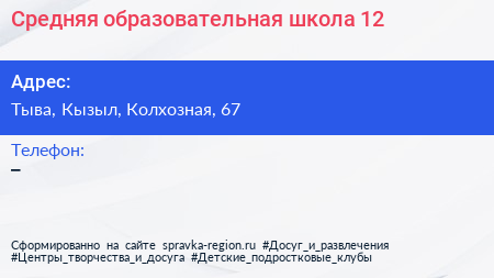 Средняя образовательная школа №12 по адресу Тыва, Кызыл, Колхозная, 67 в дальнейшем Организация, размещена в следующих категориях: