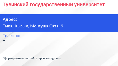 Тувинский государственный университет по адресу Тыва, Кызыл, Монгуша Сата, 9 в дальнейшем Организация, размещена в следующих категориях: