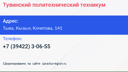 Тувинский политехнический техникум по адресу Тыва, Кызыл, Кочетова, 141 в дальнейшем Организация, размещена в следующих категориях: