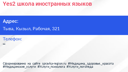 Yes2, школа иностранных языков по адресу Тыва, Кызыл, Рабочая, 321 в дальнейшем Организация, размещена в следующих категориях: