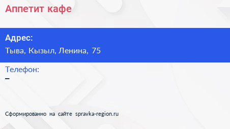 Аппетит, кафе по адресу Тыва, Кызыл, Ленина, 75 в дальнейшем Организация, размещена в следующих категориях: